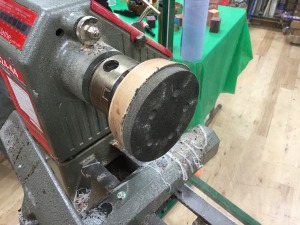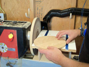 I was talking with Mike Meredith of Doctor's Woodshop. He makes an excellent line of friction finishes specifically for the lathe. As part of his demonstration, he showed me a pretty slick sanding head he made for his lathe designed to sand rounded parts. It is a pretty simple turned disk with self adhesive hook materialapplied to the face. On this, he can apply a hook and loop sanding disc directly, or a sanding pad, or even a couple of sanding pads on top of which he then adds a hook and loop sanding disc.