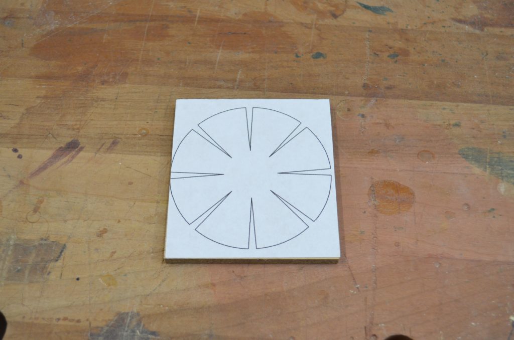 I began by drawing lines from the center of the dome 1-1/2" down to mark out the final position of the disk edge. With four of these lines, I was able to measure the actual circumference of the dome where the disc would end up. This one measured 8-9/16". Of course, the disk circumference is about 9-7/16", So I needed to cut away several "V" sections from the disc, totaling 7/8" I created a drawing representing this, and pasted it to a scrap of plywood.